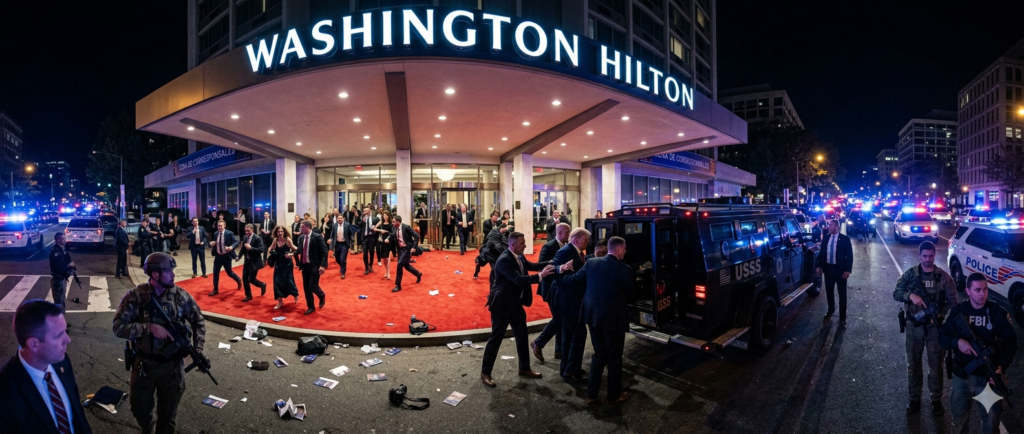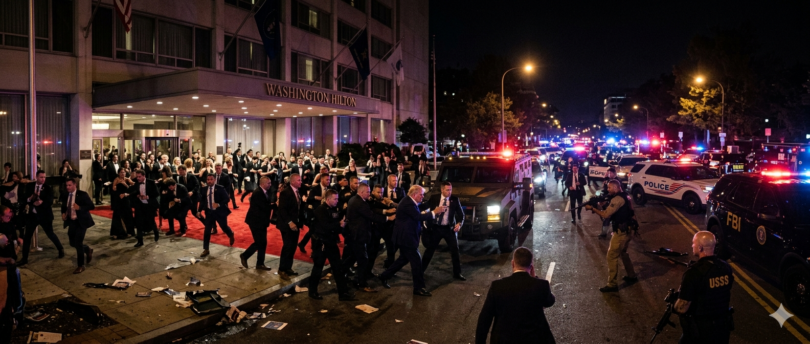 La cronología de los hechos es vertiginosa. Alrededor de las 21:00 (hora local), mientras los invitados se encontraban en el salón principal, el pánico se apoderó de la sala. Periodistas y funcionarios de alto rango se vieron obligados a buscar refugio bajo las mesas mientras agentes del Servicio Secreto, con armas largas desplegadas, rodeaban al Presidente y lo extraían del lugar en un convoy blindado a toda velocidad.